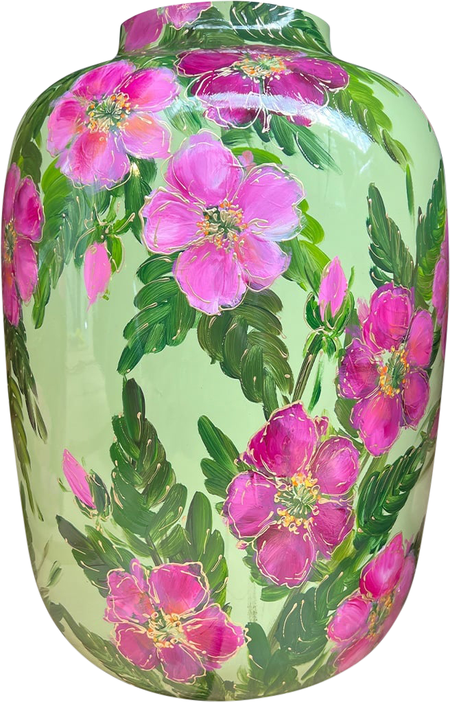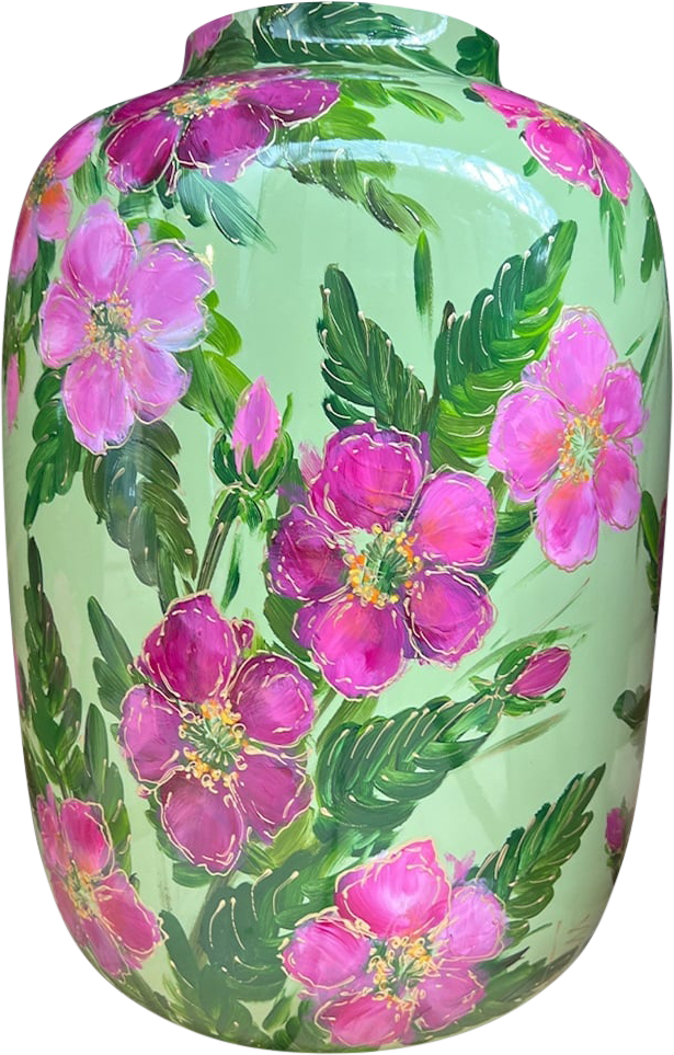 Een heldergroene vaas met handgeschilderde roze bloemen en weelderige groene bladeren. De felle kleuren en het gedetailleerde bloemenpatroon zorgen voor een speelse, levendige uitstraling.