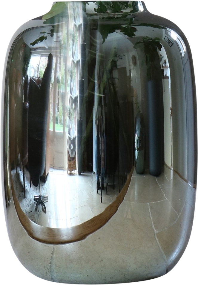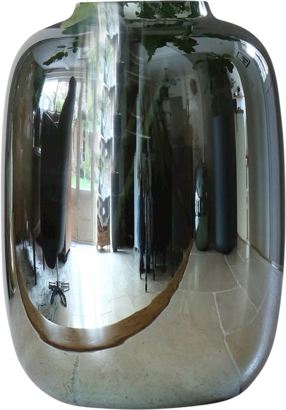 Een grote spiegelende vaas in een stijlvolle, zwarte tint. Het glanzende oppervlak weerkaatst licht en voegt een gevoel van ruimte en luxe toe aan elke kamer.