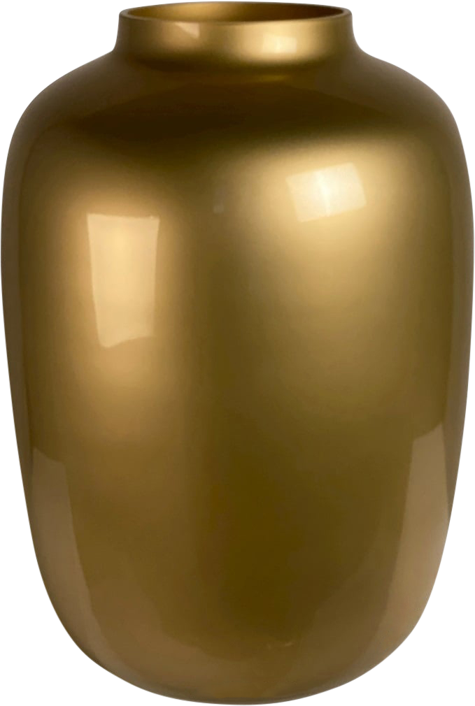 Deze gouden vaas met een slanke, ronde vorm straalt luxe en elegantie uit. Het glanzende oppervlak geeft een verfijnde uitstraling, perfect voor een tijdloze decoratie. De eenvoudige vorm maakt het geschikt voor verschillende stijlen en gelegenheden.