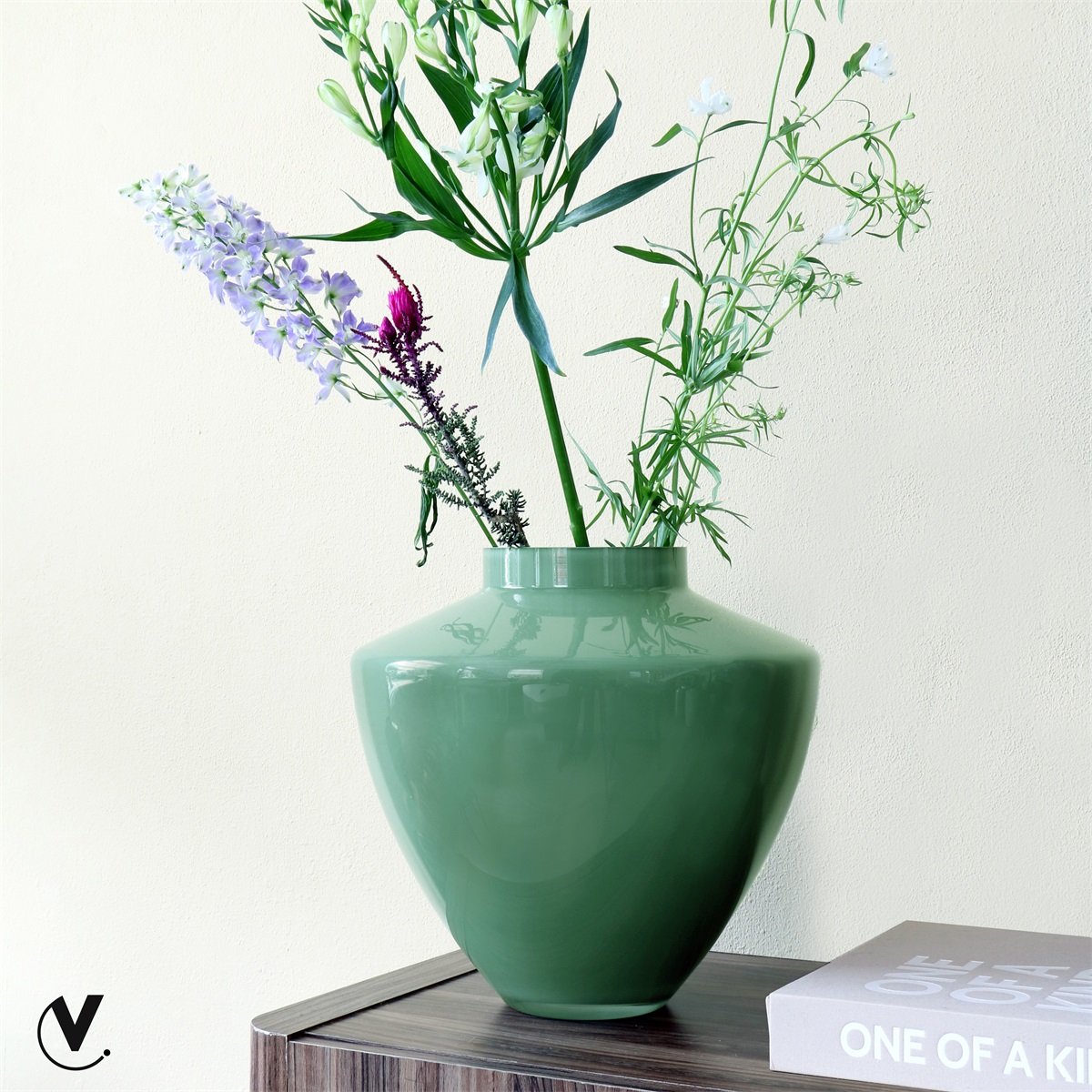 Deze vaas in zachtgroen heeft een moderne en rustige uitstraling dankzij de gladde afwerking en organische vorm. Het is een stijlvol item dat moeiteloos verschillende stijlen aanvult.