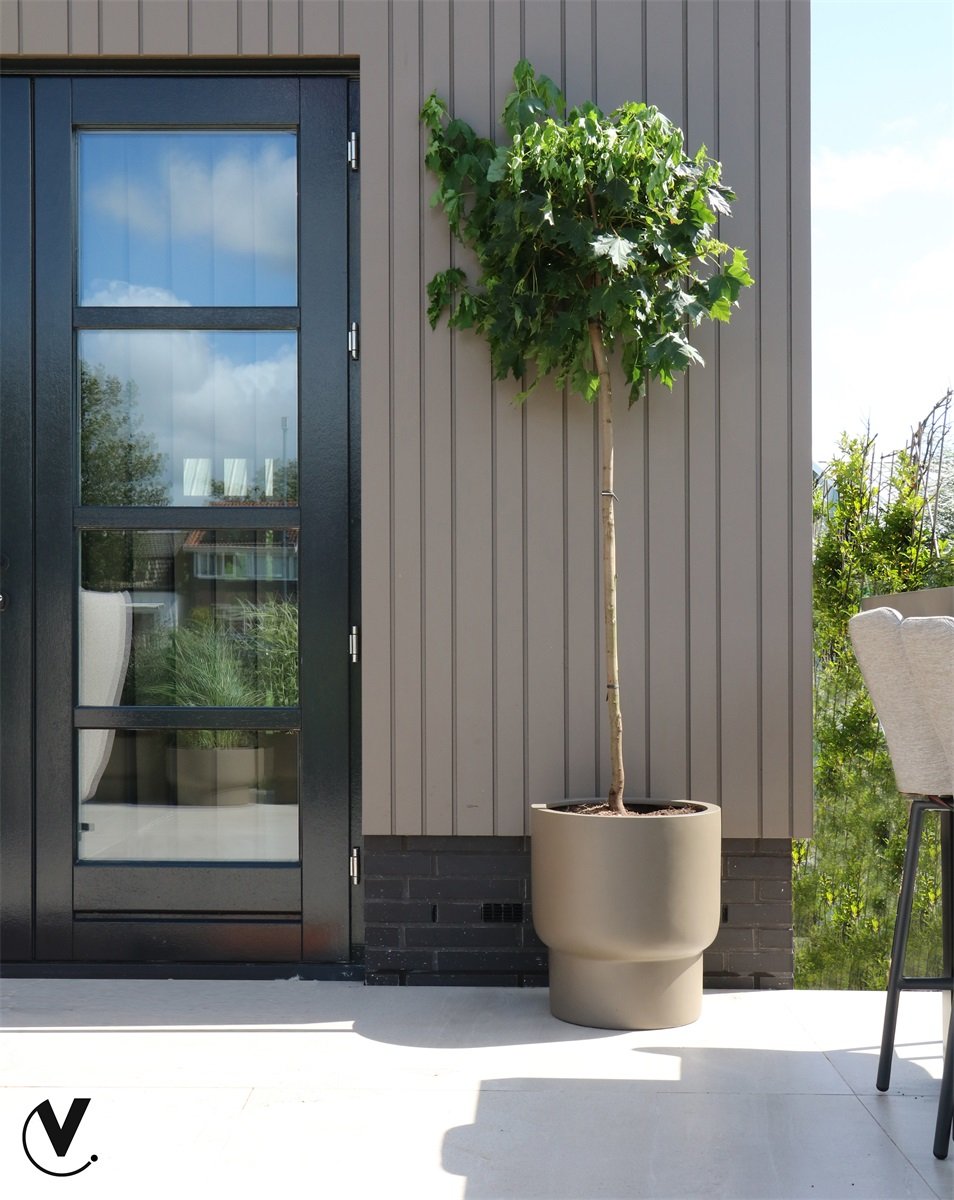 Een stijlvolle, grijze pot met een eenvoudig en strak ontwerp. De ronde vorm en gladde afwerking zorgen voor een moderne look.