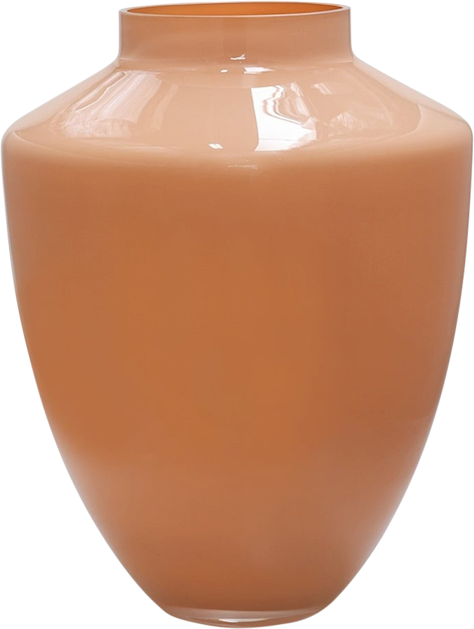 Deze vaas in perzikoranje heeft een klassieke bolvorm en een glad oppervlak. Het is een opvallend stuk dat zowel functioneel als decoratief kan worden gebruikt.